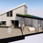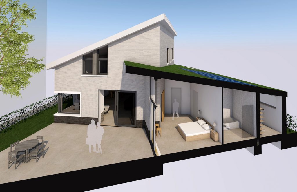 Een ruime en comfortabele levensloopbestendige woning. Onder het flauw hellende sedumdak bevinden zich de slaapkamer met badkamer en inloopkast. De badkamer is voorzien van Airspot licht- en luchtventilatie. Op de verdieping is er ruimte voor gasten.
